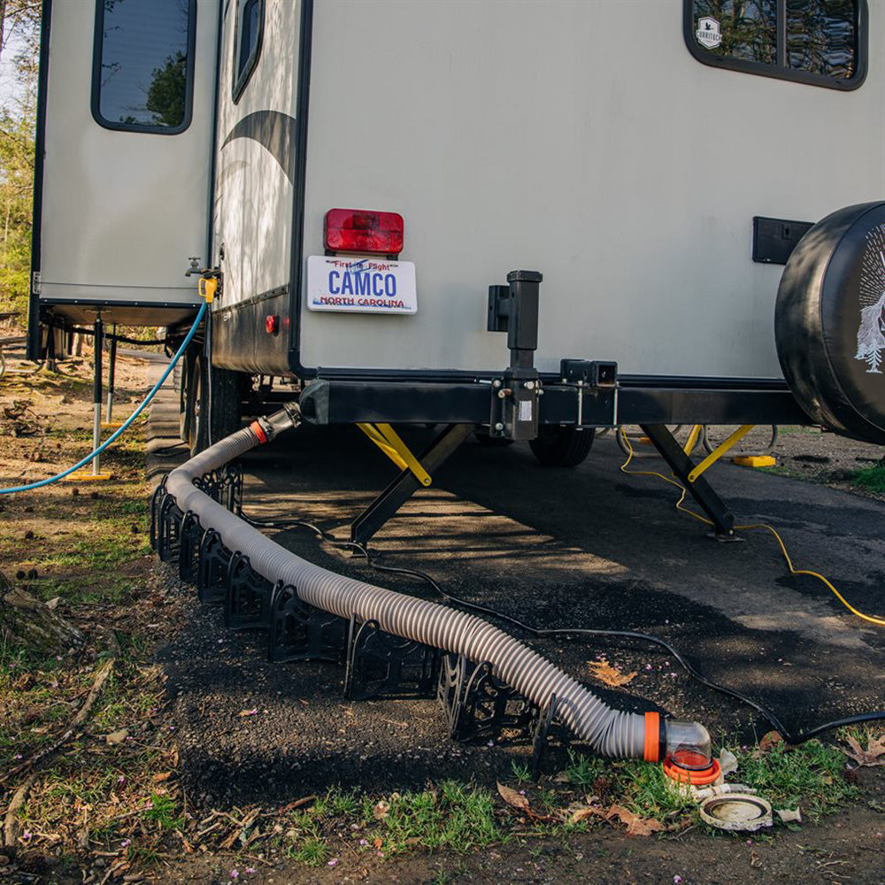 Camco's Rhino X is an all-inclusive, maximum compression RV sewer hose kit that provides the ultimate compact storage. The Rhino X compresses more than any other RV sewer hose to open valuable storage space. This 20-foot kit provides the equipment users need for a quick, reliable sewer hook-up. It includes (2) 10-foot heavy-duty 23mil polymer sewer hoses with pre-attached swivel fittings—(1) end with bayonet and lug, (1) end with bayonet and transparent elbow, and a 4-in-1 adapter; and (4) storage caps.